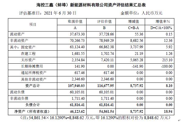 蚌埠投資集團有限公司擬轉讓所持??厝危ò霾海┬履茉床牧嫌邢薰竟蓹嗟男袨橐呀?jīng)市國資委批復同意。根據國有資產(chǎn)管理及資產(chǎn)評估有關(guān)規定,現對所涉及的資產(chǎn)評估結果進(jìn)行公示。